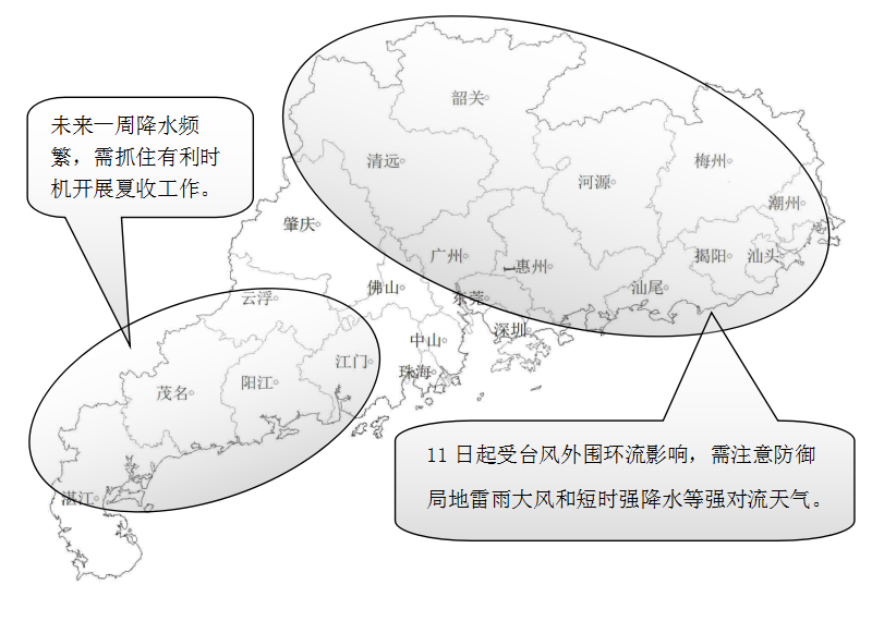 本周大部分地区早稻即将进入成熟期,仍处于乳熟期的早稻要加强后期田间管理;本周降水较多且强度较大,已成熟的早稻、花生要抓住有利时机收获晾晒,保证丰产能丰收;荔枝、三华李等成熟果实应及时采收,采收后要抓紧果园清理,并适当施肥喷药,以尽快恢复树势;注意防御局地雷雨大风和短时强降水等强对流天气。