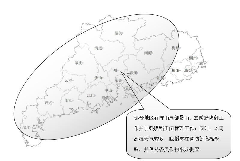 本周主要农事活动为晚稻移栽,晚稻移栽前,秧苗应施“送嫁肥”及喷“送嫁药”,已移栽地区应及时转入大田田间管理工作;本周全省部分地区有阵雨局部暴雨,需做好防御工作(图3);预计本周广东省大部分地区34℃以上高温天气较多,已播种的晚稻注意“以水调温”,增大植株间空气湿度,缓解高温影响,避免出现秧苗灼伤现象,并加强病虫害监测、防治工作。