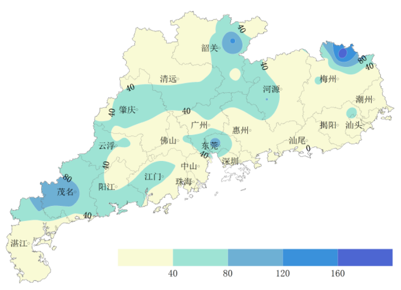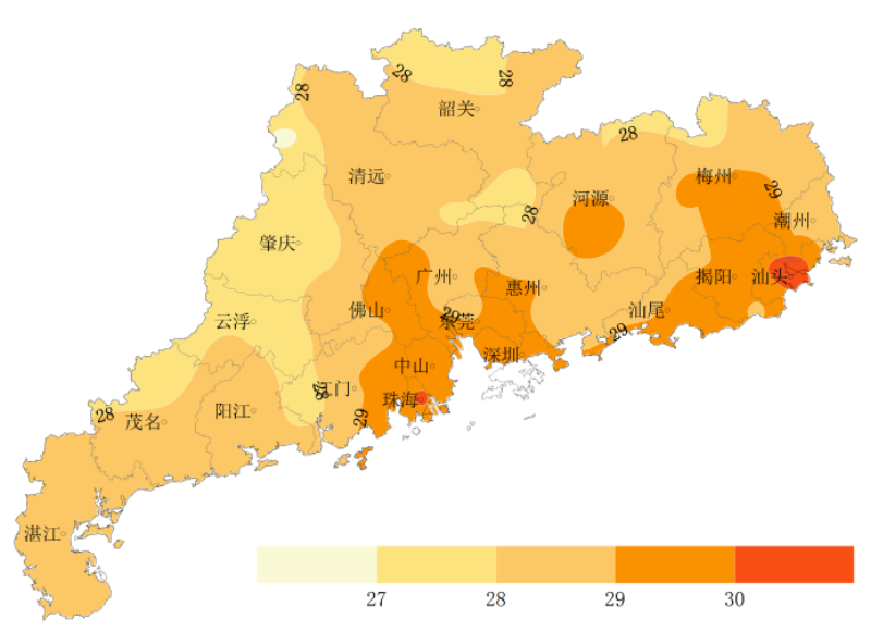 预计,6~9日,受副高边缘不稳定影响,全省大部分地区多云为主,有分散(雷)阵雨局部暴雨或大暴雨,天气炎热,部分地区有35~36℃高温;10~11日,珠江口以西有中到大雷雨局部暴雨过程,东部地区有(雷)阵雨局部大雨,其余地区有晴到多云局部(雷)阵雨,中北部部分地区有35~37℃高温。