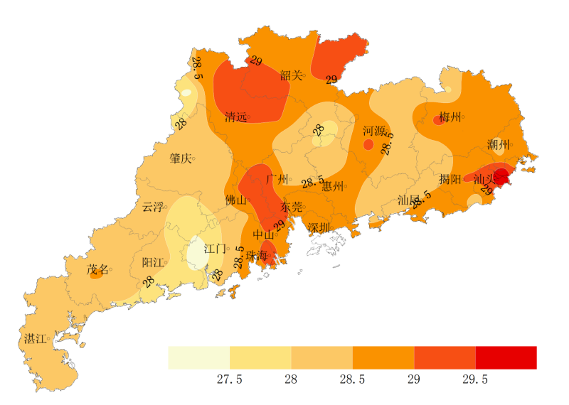 气温:全省月平均气温28.6℃,较常年同期略偏高0.1℃。月平均气温分布(图1):西北、东部大部、广佛地区28.5~30.0℃,其余大部分地区27.2~28.5℃。与常年同期相比,西南、中部大部正常到偏低1.2℃,西北、珠江口、东南大部正常到偏高1.3℃。月极端最高气温大部分地区出现在11、17日,南部沿海33.2~35℃,其余大部分地区35~36.4℃。