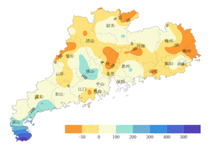 上周(8月13~19日),全省平均气温28.1℃(图1),较常年同期偏低0.2℃;全省降水量65.3毫米,较常年同期偏多17%,其中茂名、湛江局部降水偏多1~5.6倍,粤北、广州、肇庆、汕尾局部偏少5成以上(图2);全省日照时数30.4小时,较常年同期偏少3成。