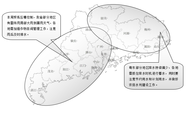 目前我省大部分地区晚稻处于返青-分蘖期,各地要注意加强晚稻田间管理,做到浅水勤灌和及早追肥,促进禾苗早生快发;进入晚稻分蘖后期的地区,要适当露晒田,以控制无效分蘖,并做好晚稻病虫害防治工作;做好荔枝果园管理工作,适时施肥喷药,培育健壮秋梢;本周受低压槽控制,我省部分地区有雷阵雨局部大雨到暴雨天气,各地需加强作物田间管理工作,注意雨后及时排水;粤东部分地区降水持续偏少,需抓住降水时机进行蓄水,同时要注意节约用水和计划用水,并做好农田水利建设工作(图3)。