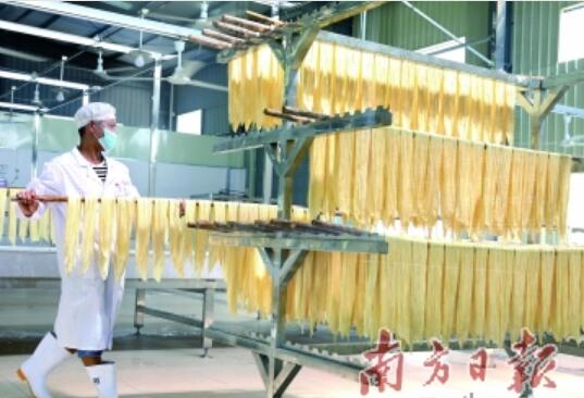 李璟介绍,灵潭腐竹曾有400多年历史,随着时间的推移与技术的流失,以小作坊生产为主的传统产业逐渐衰落。如今,在腐竹厂的带动下,灵潭腐竹这一传统产业重焕生机,同时还吸纳贫困户在腐竹厂就业。
