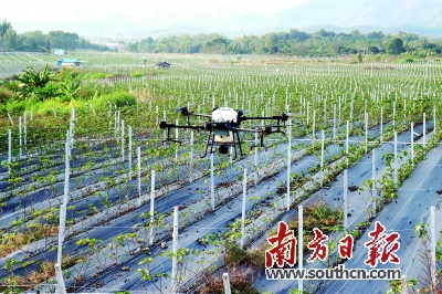 11月19日,在水头镇石潭村的无花果种植基地里,一架大型植保无人机正在给大棚内的无花果树均匀地施肥打药。在越秀区帮扶工作队和当地村“两委”干部的推动下,这近千亩的无花果基地成功落地水头镇,成为附近贫困户脱贫增收的新希望。