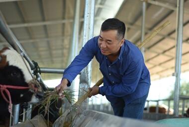 记者从大棚种植基地沿着山路往山上走,不到10分钟就来到松梅村黄牛养殖基地。牛圈里的数十头黄牛一见到邓尚演便围了过来,就像见到老朋友一样。邓尚演捧起一把草饲料放进食槽里,摸了摸小牛崽头上的白毛。