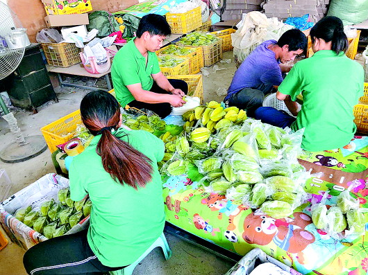 “我们正在给杨桃盖被子咧,防止寒风!”农户何球在杨桃树上边拉着遮阳网罩,边采摘成熟的杨桃。何球家的杨桃刚从树上摘下,便被马不停蹄地送到了绿安杨桃专业合作社,多名社员正围着一大长桌的杨桃忙活:分拣、拆袋、套袋、装箱……从农田到市场,从采摘到包装到销售,麻榨镇到处一派繁忙景象。
