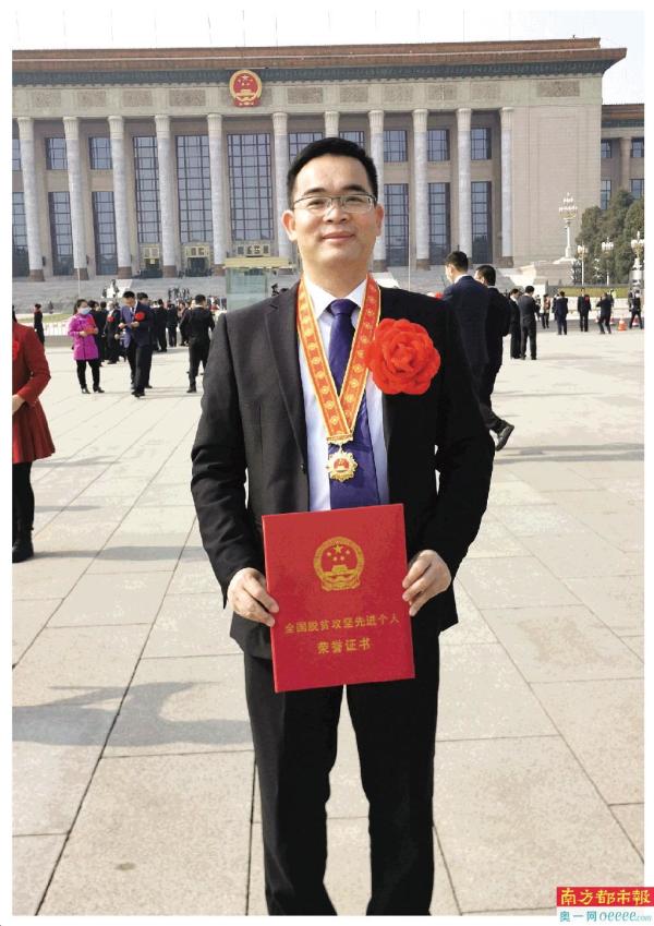 2月25日,获全国脱贫攻坚先进个人表彰的张立业在人民大会堂前留影。