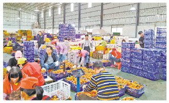 在沙糖桔加工仓储与物流交易中心,工人忙着分级、包装。