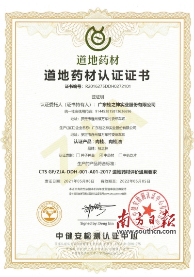 另外5家取得道地药材证书的企业分别是罗定市连州镇利华玉桂种植专业合作社、广东荣兴香料科技有限公司、罗定市新越桂中药材种植专业合作社、罗定市兴伟香料有限公司、罗定市粤桂实业有限公司,获得认证的产品有肉桂、肉桂油、桂枝等。