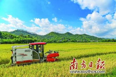 盛夏7月,又到早稻成熟时。沿着广东最美旅游公路——省道S223线驶入位于梅县区丙村镇溪联村的稻丰米业水稻机械示范基地,阵阵稻香扑鼻而来。放眼远眺,沃野平畴,年谷丰盈,450亩早稻已经成熟,微风拂过,掀起滚滚稻浪。