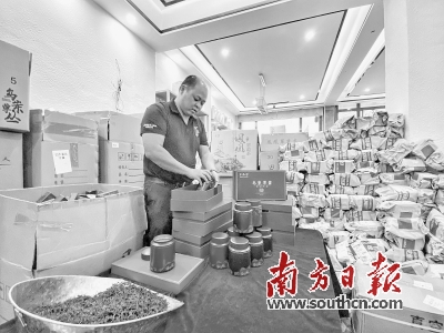 8月10日,在宋茶荟凤凰单丛茶电商基地,包装好的快递包裹几乎堆到超过1.5米高,蓄势待发。“今天有3000多票快递的货准备发到全国各地。”蓝泽敏称,线上直播是单丛茶打开销路、提升知名度的重要渠道之一,他们刚通过网络大咖在直播平台进行线上带货,促进销量提升。“我们全国有136家加盟店,线上销售就占了三分之一。”蓝泽敏称,电商渠道能迅速得到消费者对产品的反馈,更准确了解市场走向,2020年该品牌线上销售额超过4000万元。