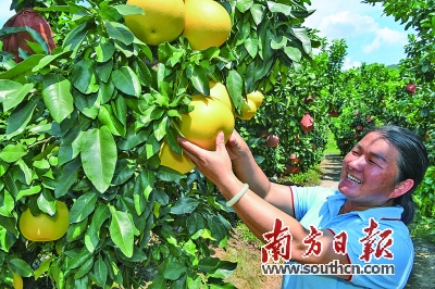 “五谷丰登粮满仓,鸡鸭成群猪牛良。柚子满山像金子,金柚爽口似蜜糖……”在梅县区、大埔县,丰收的歌谣响遍山头。放眼望去,千亩柚林绿意盎然,步入林中,一颗颗硕大饱满的柚果缀满枝头。目之所及皆是金黄,行之所达满是柚香。