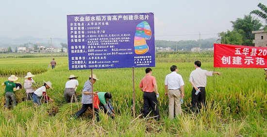 五华县2009年早造全国水稻高产创建活动万亩示范片平均亩产达656.93公斤,比去年同期亩增99公斤,增长17.8%,超出农业部要求的目标产量206.93公斤。这是省粮食高产创建专家指导组7月8日实割验收的结果。