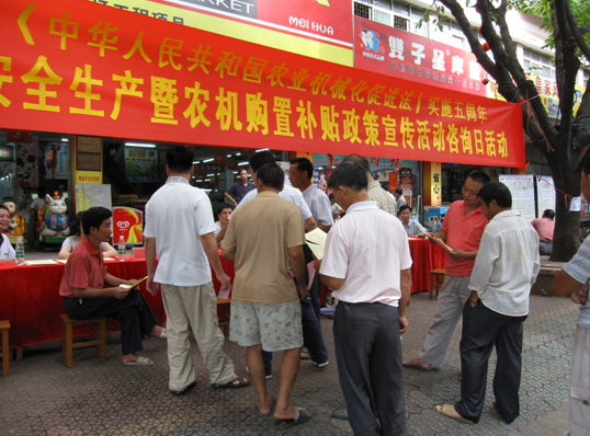 2009年7月21日,由广州市农业局主办,各区(县级市)农业农机主管部门协办,广州市农机监理所承办的广州市农机安全生产暨农机购置补贴政策宣传活动咨询日活动拉开帷幕。该活动按照广东省农业厅《关于转发安全生产宣传教育行动实施方案的通知》以及《转发省安委办关于认真落实国办发[2009]32号文件扎实开展安全生产三项行动的通知》要求,同时以庆祝《中华人民共和国农业机械化促进法》实施五周年为契机,活动涉及七个区县。活动内容主要是宣传农机安全生产,提高广大农民群众的安全生产意识和知识水平,树立农机监理形象;宣传农机购机补贴政策。
