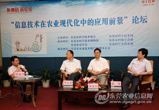 9月25日上午,“东莞创新论坛”2009年第十六期活动――“信息技术在农业现代化中的应用前景”论坛在市科技馆举行。近年来我市产业转型升级,农业用地逐年减少,正确利用信息技术,是在这新形势下实现东莞农业现代化不可缺少的工具。