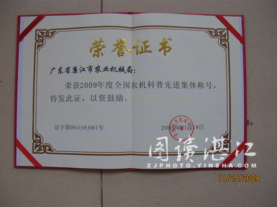 廉江市农机局在推广农业机械化工作中成绩突出,最近,该局被评为 “2009年度全国农机科普先进单位”(广东省只有两个单位获奖),同时,该局局长黄存德被评“2009年度全国农机科普先进个人”。