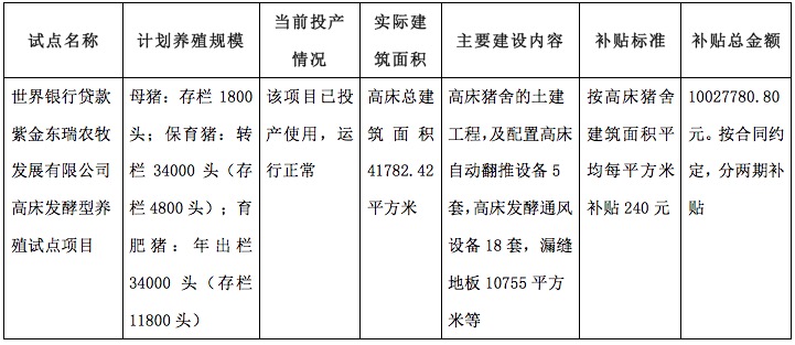 世界银行贷款紫金东瑞农牧发展有限公司高床发酵型养殖试点项目补贴公示
