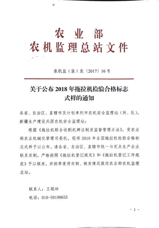现将农业部农机监理总站《关于公布2018年拖拉机检验合格标志式样的通知》(农机监(装)发〔2017〕16号)转发给你们,请按照通知要求,尽快统计好本辖区所需的2018年拖拉机合格标志数量,于2018年2月28日前汇总报省农机试验鉴定站,并随订单附上相应的订购款项的银行电汇凭证复印件,以便统一订制。请各单位于2018年每季度末将标志定制及核发情况报省农机试验鉴定站。