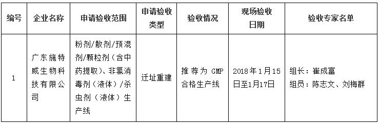 根据《兽药生产质量管理规范》的规定,依照《兽药生产质量管理规范检查验收办法》,广东省农业厅派出的专家组对以下1家企业实施GMP的情况进行现场检查验收。现将检查情况在广东农业信息网上予以公示,公示时间为2018年1月18日至2018年2月1日,如有不同意见,请将意见和建议反馈给广东省农业厅兽药GMP工作委员会办公室。