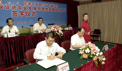 8月13日上午,广东省农业厅与国家开发银行广东省分行在穗举行“十一五”期间支持社会主义新农村建设、促进农业发展开发性金融合作协议签字仪式。广东省农业厅谢悦新厅长、国家开发银行广东省分行戴达年行长代表双放在协议上签字并作了讲话。双方表示,在农业农村领域开展开发金融合作是我省新农村建设在融资方面采取的一项标志性行动,有利于充分发挥政府部门的组织协调优势和开发银行的融资优势,打通我省农业发展、农村建设的融资渠道,为社会主义新农村建设注入动力。