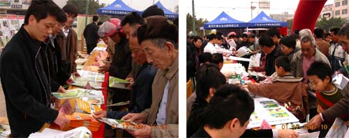 此次下乡活动以科技大集的方式进行,参加下乡活动的有省农科院、华南农业大学、仲凯农业技术学院,省农展馆、省杂优站等厅直属单位,河源市和紫金县农业局以及部分涉农企业等60多名专家、技术人员和工作人员参加,现场为资金县农民的农业生产把脉、开方、诊病,并根据紫金县的农业种养特点,为400多名种养专业户举办了生猪养殖技术和禽病防治两个专题技术讲座。据统计,此次科技下乡活动共向当地农民赠送农业科技图书和资料16000多份,杂交水稻种子300kg,蔬菜新品种2000多包,复合肥料3000kg。此次科技下乡活动受到了当地农民的普遍欢迎,有数千名农民到现场进行咨询,多次涌现出农民排队领取种子、肥料和图书资料的动人场景。