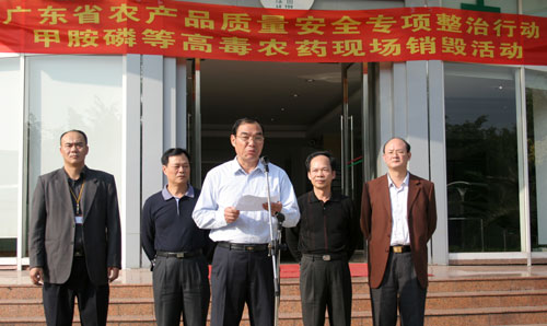 昨天(12月12日)下午,广东省农业厅在广州举行甲胺磷等5种高毒有机磷农药现场销毁活动,将今年以来特别是专项整治以来,全省各级农业、工商部门依法收缴的3903.15公斤甲胺磷、久效磷、甲基对硫磷等5种高毒有机磷农药进行现场监督销毁。省农业厅副厅长蔡汉雄亲往销毁现场进行监督,他表示,此项活动标志着广东省农产品质量安全专项整治中甲胺磷等5种高毒有机磷农药专项整治100%收缴销毁工作目标的顺利实现。