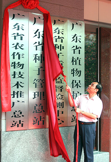 根据粤机编办[2008]14号文批复,在广东省农业良种示范推广中心的基础上设立广东省农作物技术推广总站,设立后的广东省农作物技术推广总站保留广东省农业良种示范推广中心牌子。主要职能是承担农作物新品种区域实验、生产示范和良种繁育推广工作;负责农作物高新技术及配套技术的引进、集成、示范和推广;负责农作物种质资源的收集、整理和保存工作;负责收集、引进和保存、展示国内外农业名优、珍稀品种;指导全省农作物生产基地建设。图为蔡汉雄副厅长为广东省种子管理总站和广东省农作物技术推广总站揭牌。