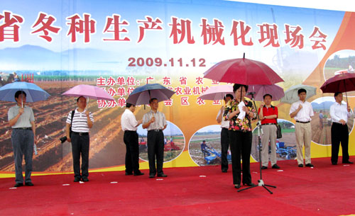 为了更好地推动全省冬种生产发展,广东省农业厅于11月12日在江门新会区召开全省冬种生产机械化现场会。现场会邀请了25家农机生产企业,展示和演示了先进实用,比较适合广东省冬种生产和机械化技术与装备,参加展示和演示的机具有100多台套,涵盖了冬种生产的整地、节水灌溉、植保、中耕和收获等环节;总结交流了广东省各地推广冬种生产机械化的经验与做法,江门市农业局、惠东九华农贸有限公司惠州市农机技术推广站、徐闻县农机局和高州市农业局分别介绍了推广冬种生产机械化的做法和经验。
