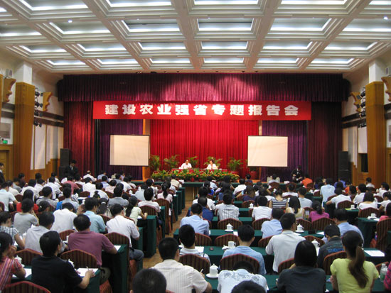 报告会上,关锐捷副司长“以‘三个确保’为目标,加快农业农村经济发展”为报告主题,进一步宣传了党的十七届三中全会提出关于我国农村改革发展的基本目标和任务的指导精神,细致分析了新时期我国现代化建设进程中,农业所面临的严峻挑战和重要战略机遇,提出了当今农民问题的根本核心问题是基本权益问题,要勇于用创造性思维解决所遇到的“三农”问题。同时,关司长还阐述了“以生产能力提升确保国家食物安全,以生产关系变革确保农民基本权益,以生态环境改善确保健康持续发展”的“三生”事业与农业工作者共勉。
