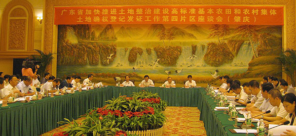 为加快推进土地整治,大规模建设高标准基本农田和推进农村集体土地确权登记发证工作,广东省政府先后于2012年8月9日、10日、13日在全省分5个片区召开加快推进土地整治、建设高标准基本农田和农村集体土地确权登记发证工作座谈会。各地级以上市及顺德区副市长、各县(市、区)政府主要负责人,国土资源局、财政局、农业局主要负责人参加会议。