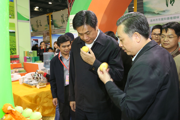 在参观广东名特优新农产品展示区时,邓海光非常关心产品推广情况。邓海光说,要积极打造“岭南佳果”系列,根据不同时节,把广东当季的名特优新农产品大力推向市场。