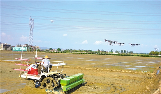 卫星导航、无人机、5G、云计算、人工智能……“五一”劳动节前后,记者走马春耕一线,发现越来越多的高科技被应用于粮食生产。广东传统农业正加速迈入智能时代——从“人扛牛拉”到“机器耕种”,从“依靠经验”到“依靠数据”,从“传统农业”到“智慧农业”,粮食的耕种、杀虫、施肥、浇水、收割等,都可以由机器操作完成。科技、智能化设备成为粮食生产利器,促进广东粮食生产效率跨越式提升。