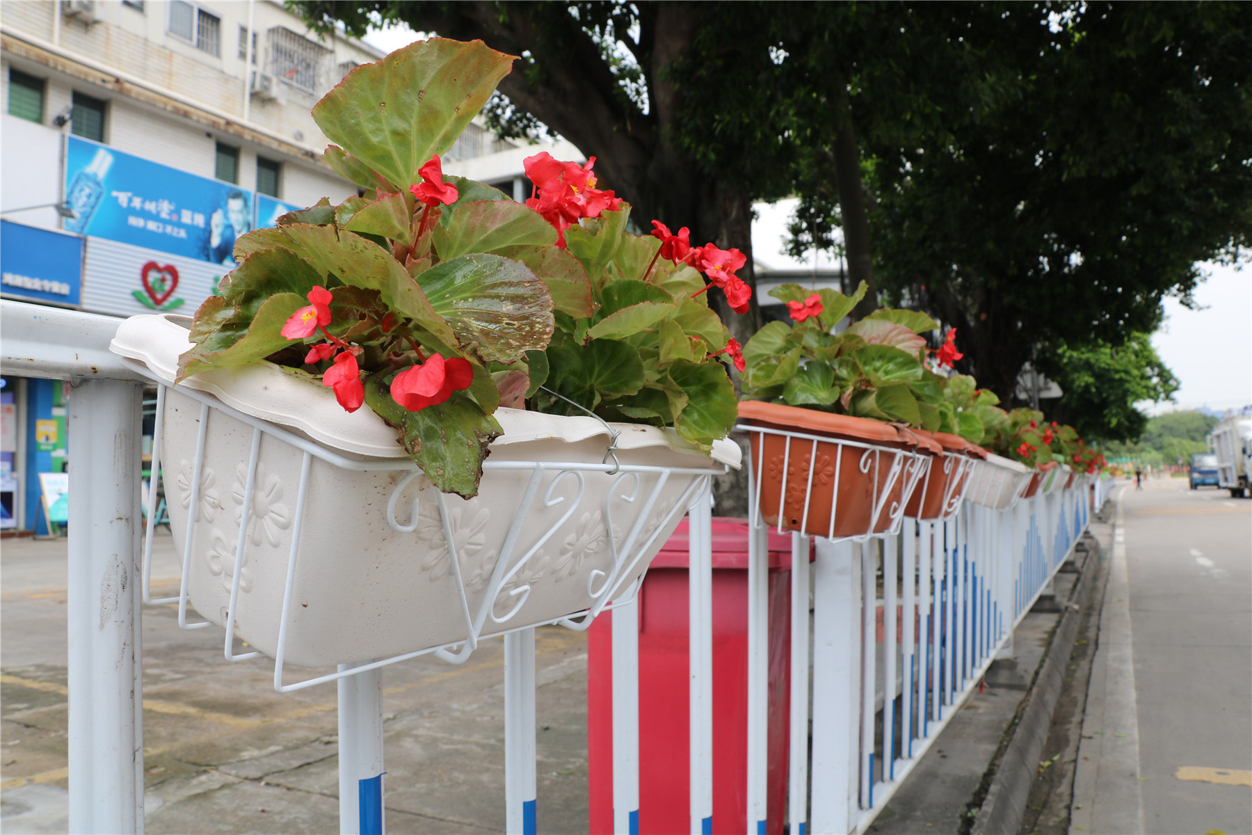 招大社区路边护栏上的花盆,是党员购买并安装的。(来源:珠江时报)