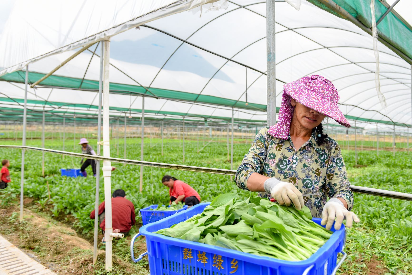 东源县梨园村有机蔬菜种植基地工人正在采摘蔬菜。(摄影:杨坚)