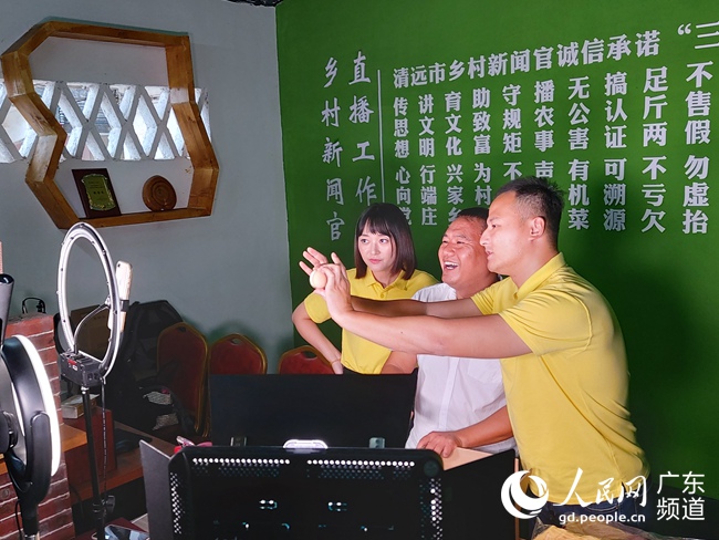 刘逢明(中)在直播间里卖力推销水西村鸡蛋。 赵唯淞摄