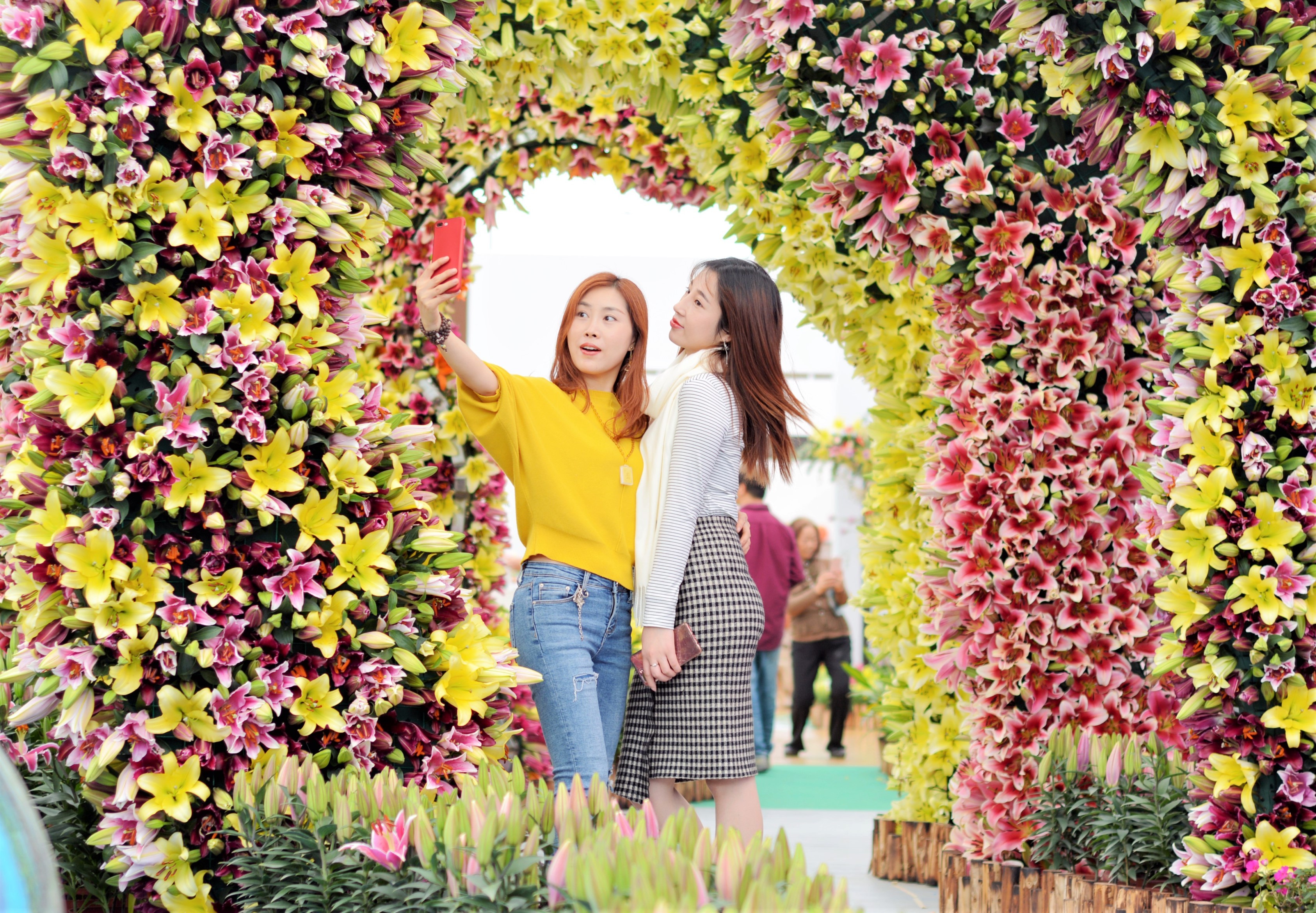 佛山南海推出买花+乡村游线路,鼓励市民到种植基地参观采购。图为2020年第九届百合花文化节上,市民在百合花景前拍照打卡。(摄影:崔艺文)