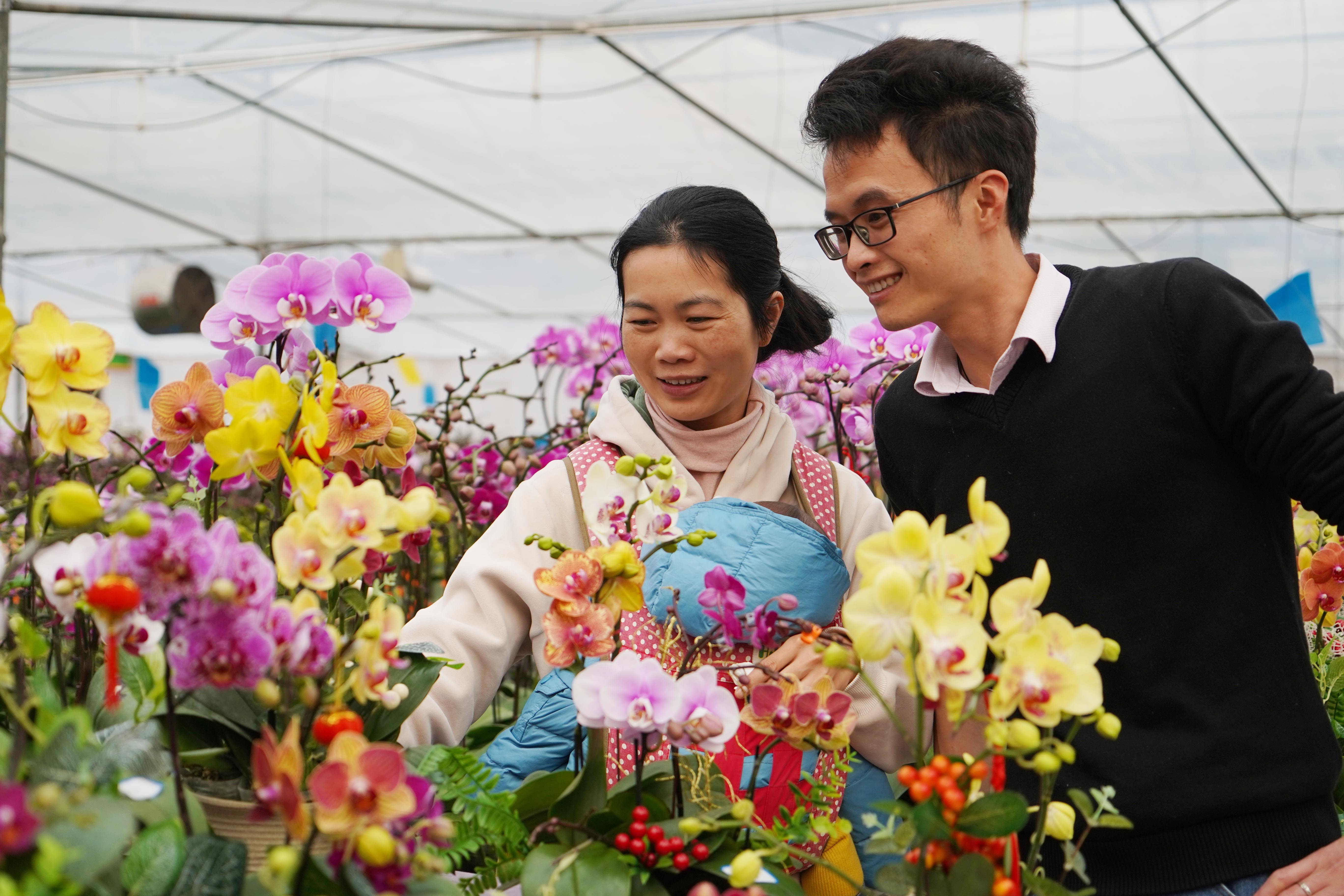三水云东海街道一家大型蝴蝶兰种植场内,消费者正在选购年花。(摄影:赖基润)