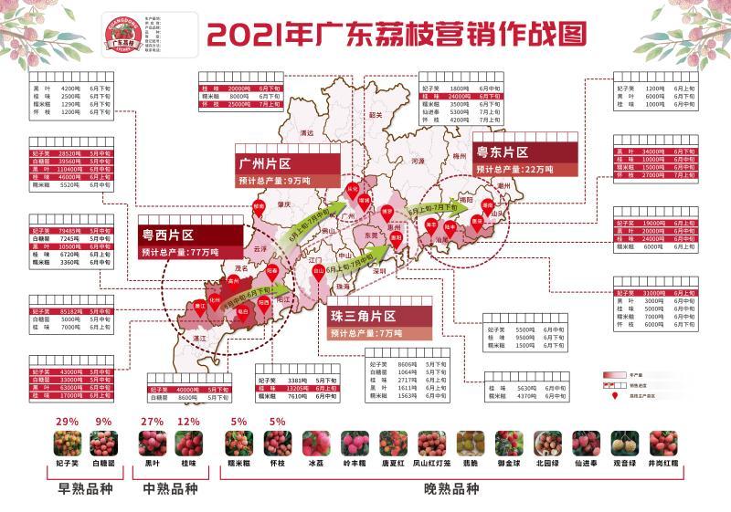 按照这张“2021年广东荔枝营销作战图”,从5月上旬开始到7月上旬,广东四大片区的荔枝将次第上市,带来整整三个多月的甜蜜夏日。