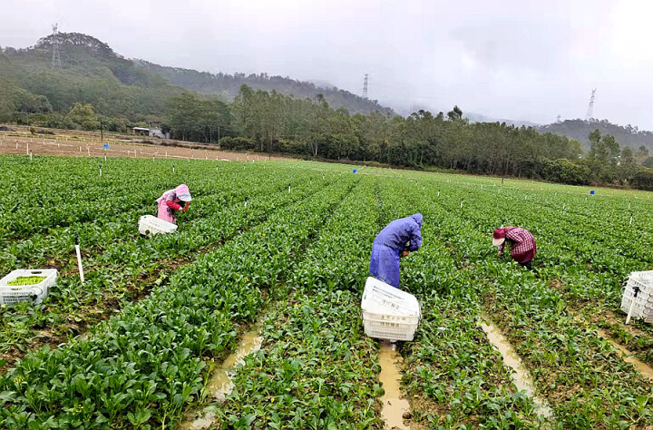2月22日上午,冷雨依旧淅淅沥沥,在博罗县公庄镇大陂村,博罗县金信农产品种养专业合作社的蔬菜种植基地里却一片忙碌,工人们披着雨衣在采摘菜心,然后将菜心装筐、上车,再运到市场销售。该合作社负责人李志明说,雨水太多,会让蔬菜出现烂叶;持续冷雨也会将蔬菜冻坏,“冒雨抢收蔬菜,既是为了降低损失,也为了保障市场的供应。”在蔬菜地的另一边是另外一番忙碌的景象,20多个工人在整地、起陇,准备播种。李志明说,冷雨天,市场的蔬菜肯定会受影响。及早谋划,将地整好,天气好点,就可以播种、抢种,这样蔬菜就能第一时间供应,能保持市场蔬菜的正常供应。